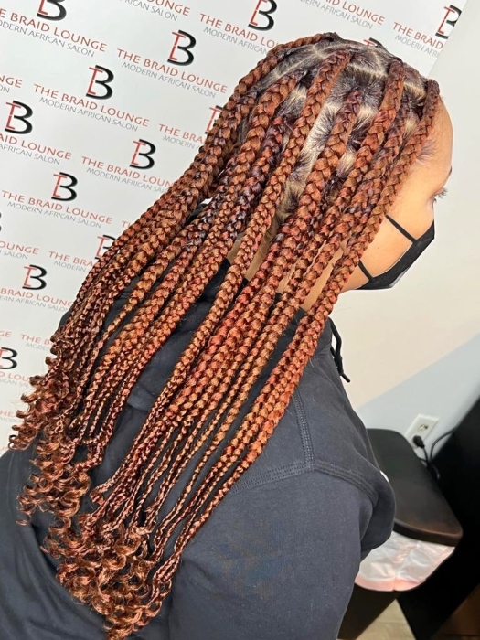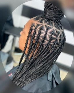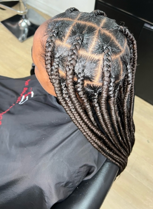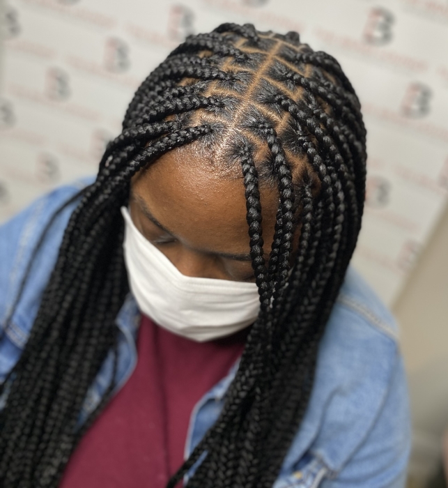 Most natural looking box braids with the least amount of tension on your hair. This look is created with square parts. Xpression hair is included for this service.